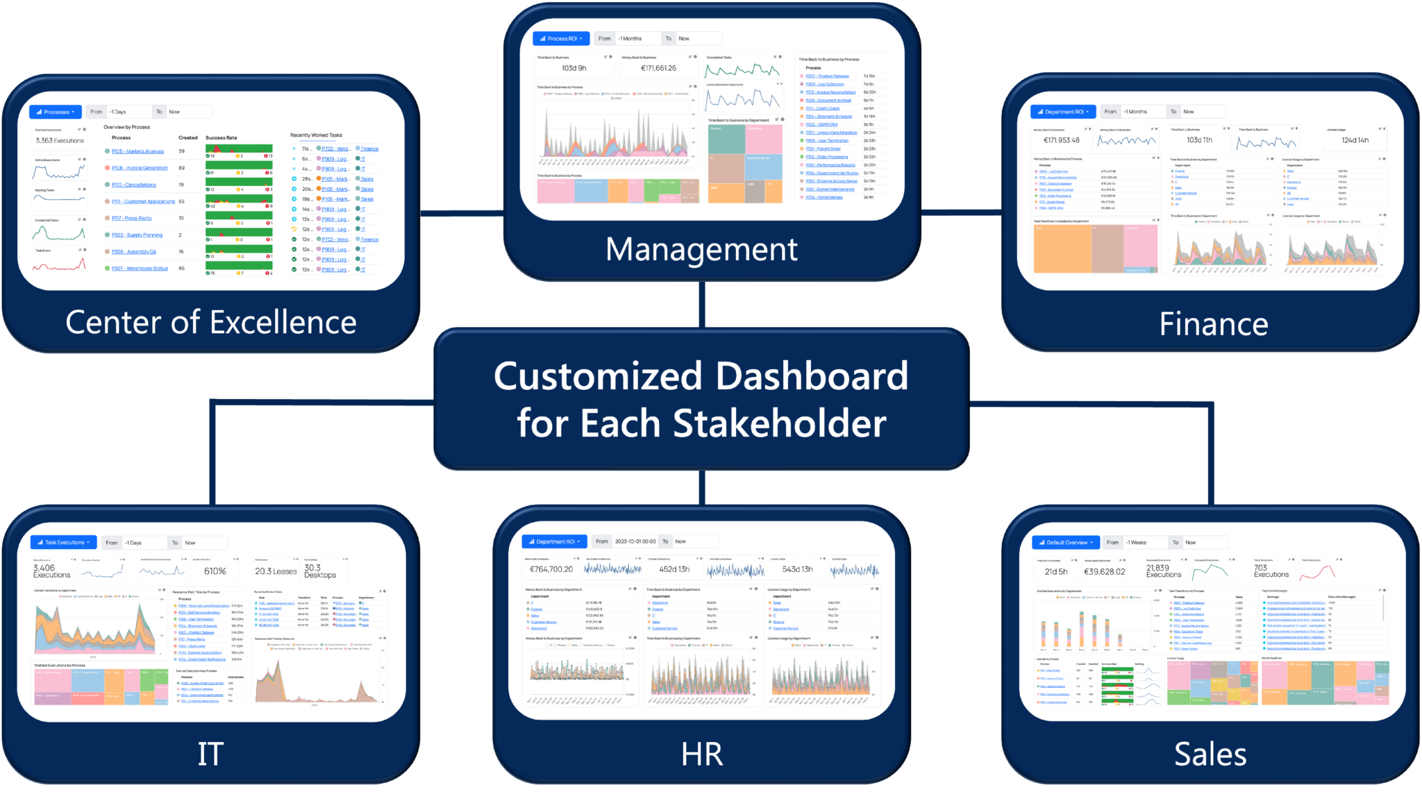 Well designed dashboards are an efficient way to ensure transparency and drive efficiency. All stakeholders have their own unique set of requirements to carry out information-based decisions. Process owners need to see if robot executions have been successful; DevOps need to have an overview of – well everything – whilst the management team is just interested in the monetary reward of their automation Investment.